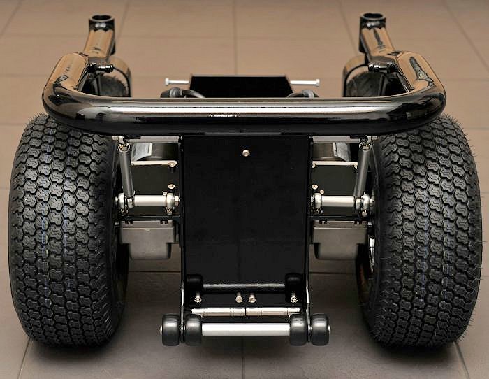 Rear wheels are located further forwards under your backside for control, and for wheelies, and to allow use on soft ground without caster wheels sinking. They will be very lightly loaded on completion. As per the MK2 chair.