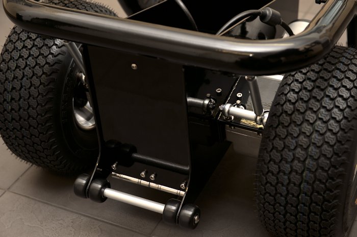 We are now using HEGAR alloy wheels, and different wheel adapters. These are much better quality, and properly designed for these tubeless tyres. They are split rims, and sealed with silicone rubber in the centre. Here you can see the high quality gloss hard powder coating on every part. Every bolt is stainless steel, and every bearing also is stainless steel. There are 16 stainless steel bearings in this picture! As well as two stainless steel needle bearing hinges on the battery compartment door! And 10 rose joints...
