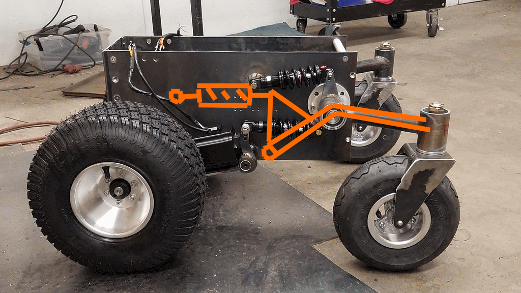 I'm out of real estate for much different. Two actuators still have to be fitted. One is big. The bolt holes between the shocks are for it. The bottom of the chair is above the caster axle centerline anyway. No way to completely eliminate it without affecting ground clearance.