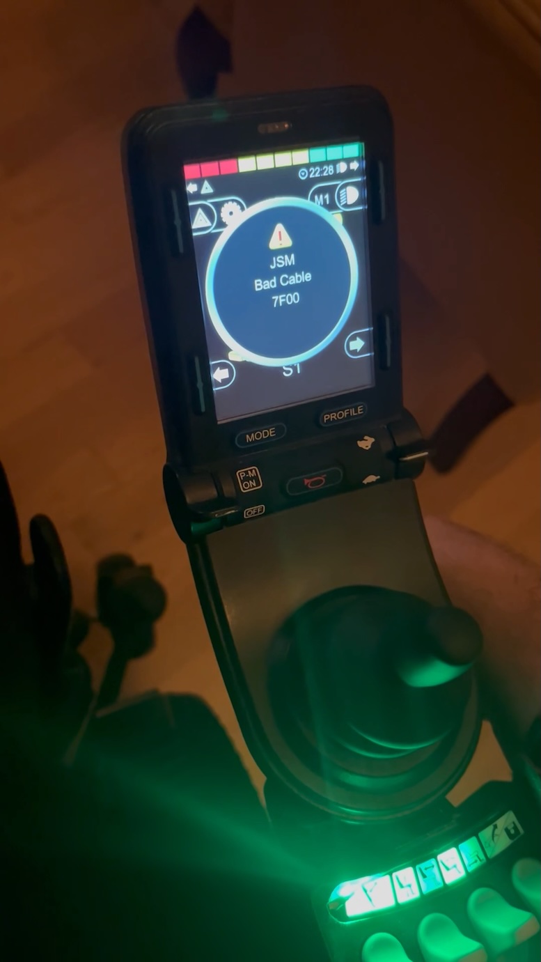 I monitored this over the next day and noticed I was getting both PM and JSM Bad Cable 7F00 errors. This would be displayed every 5 seconds for 1 second, often alternating between the two different errors. The wheelchair was still functional, but it was throwing these two errors.