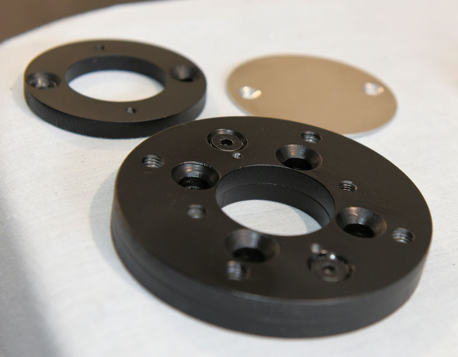 Get some 6 inch flat plate alloy disks cut, with 4 bolt holes and a 50mm centre hole...
