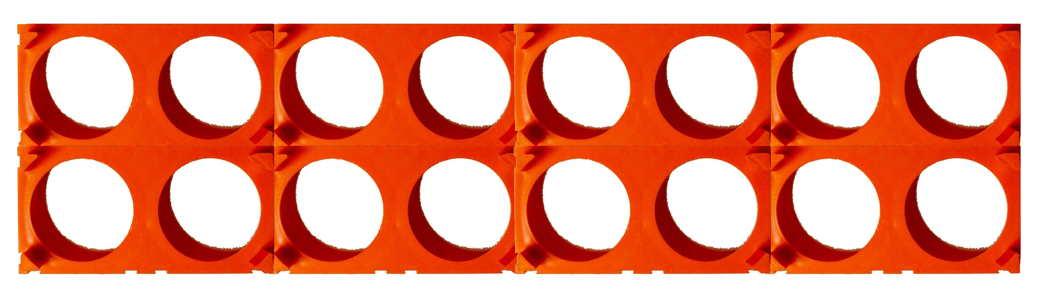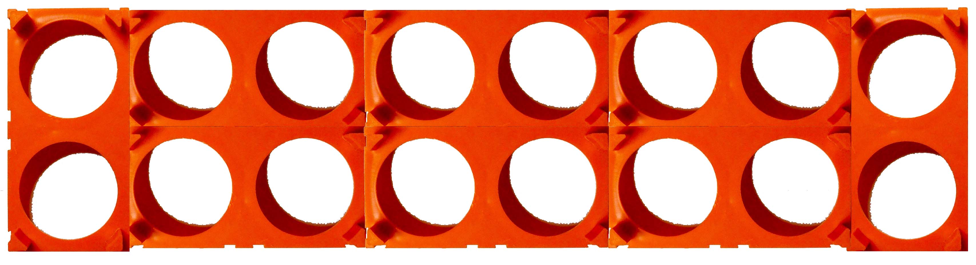 Here is how to assemble the orange blocks. For the top of the add-on battery, the outside rows are vertical in the picture while the 6 inner blocks are horizontal. We will use 3 square bus bars in the inner 6 blocks and 2 single bus bars on the outside 2 rows.