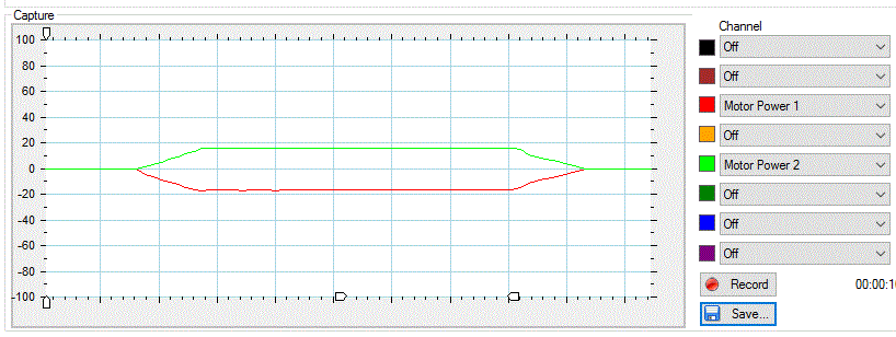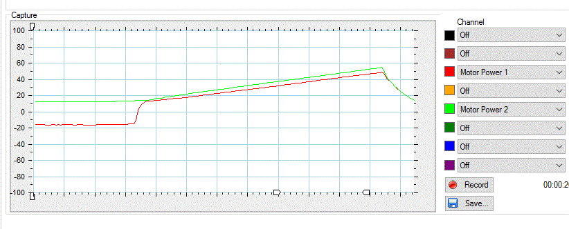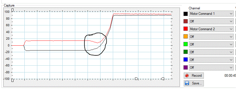 This is what I would EXPECT to see. This is actually what we see when I just look at the joystick input. (And what I would logically expect the motors to do unless I am wrong.) They converge, (the forward going wheel slows down), then both rise together. Ringed. Note, this is not from the same graph, its simply in place of a drawing to demonstrate what I think should happen!