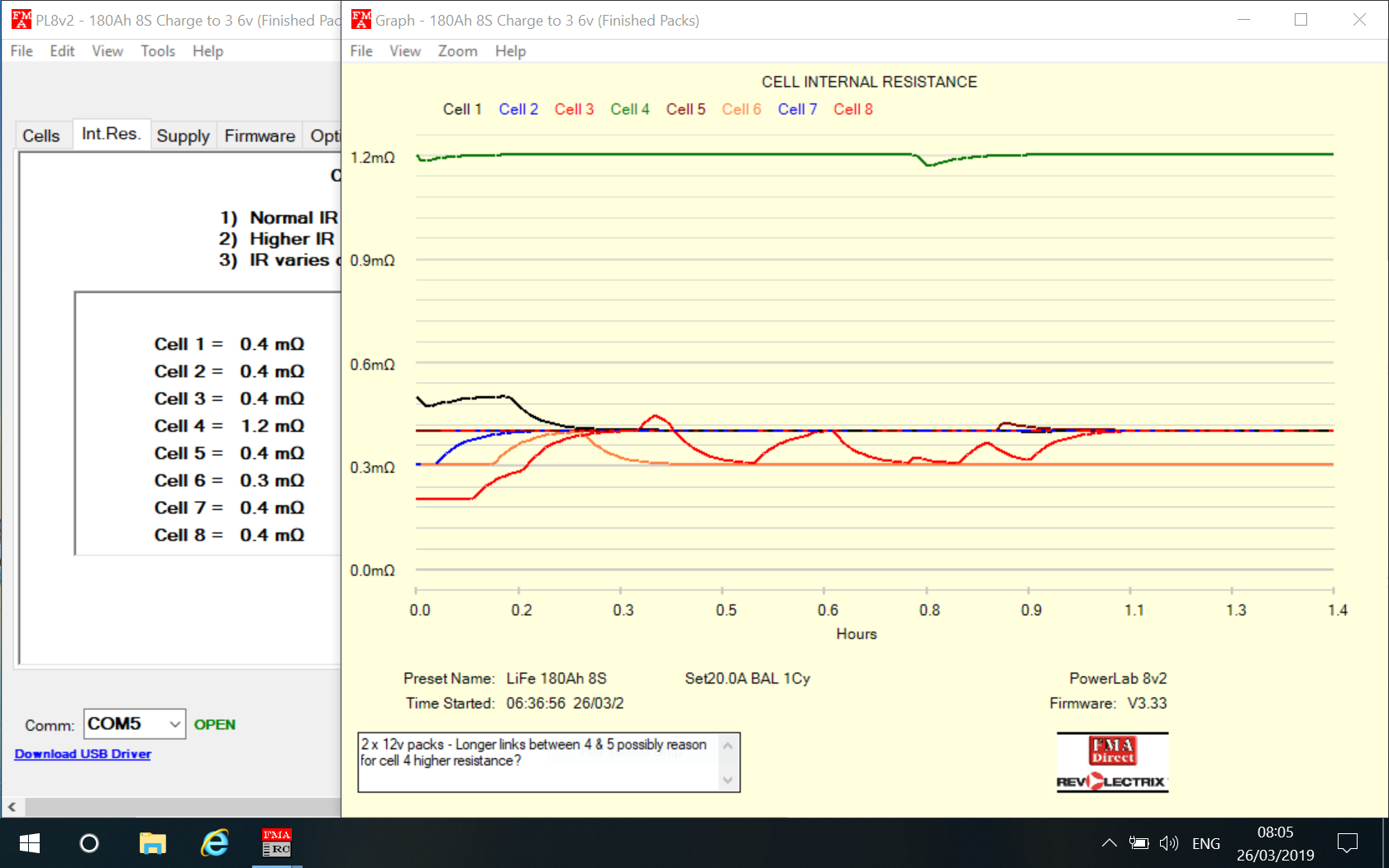I wonder whether the higher cell resistance of cell 4 is due to me having two physically separated 12v packs. The series links between 4 and 5 are about 3x longer than the series links between the other cells.