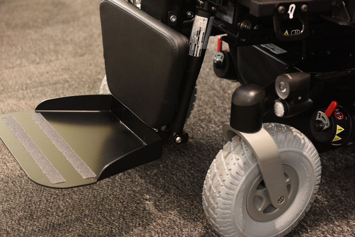 Footplate works well, electrically adjustable for length too. But will hit the tyres if seatmoved back. So smaller tyres will be needed. 280/250-4 instead of 3.00 x 4. And possibly a hacksaw adjustment to the plate rear corners.