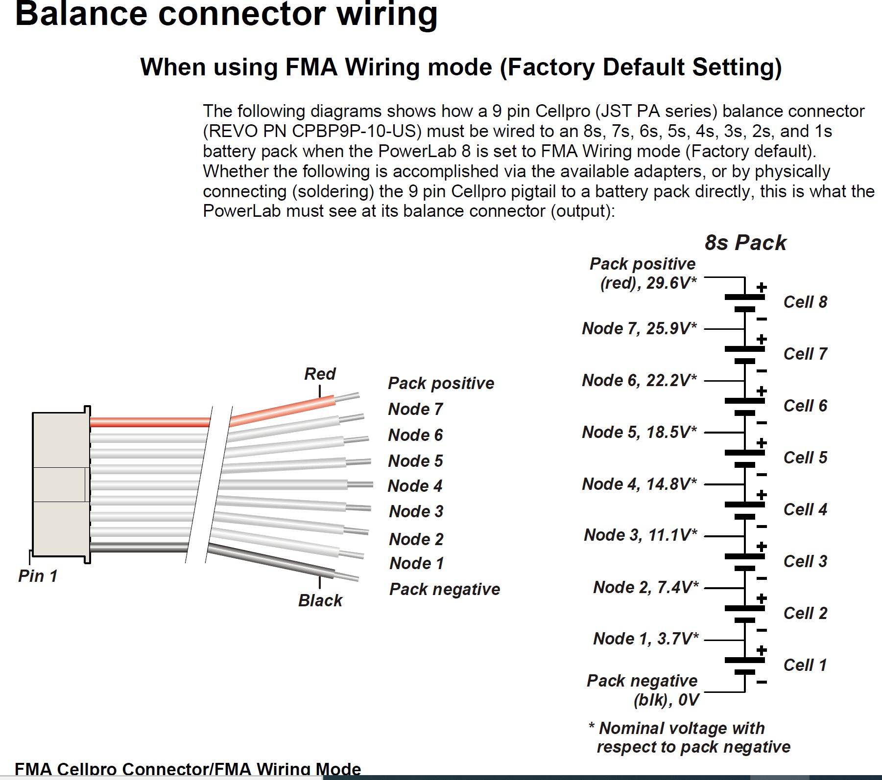 Melissa helped me to create a wiring harness to allow me to charge 8 cells using a PL8 balance extension cable with terminal rings crimped and soldered on. Testing the pack with my Fluke 289, it reads 26.xx volts with 8 cells in series. But if we measure each pin on the balance plug we get the following...