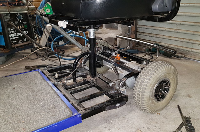The frame has a separatable rear subframe with the motor/transaxle can detach from the front half with the batteries. I never take it apart for transport so it seemed natural to hinge & spring the rear subframe to address comfort on rough trails and the frame breakage problem.