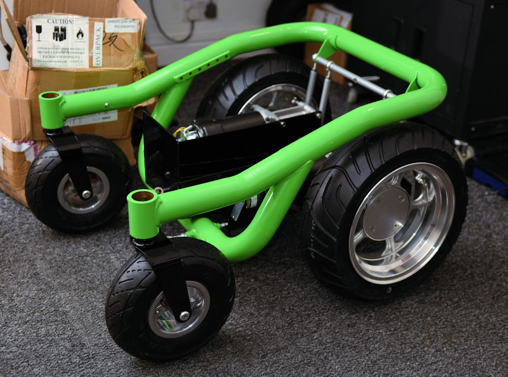 Some other things worry me. Those wheels (all 4) are not going to work on anything soft, grass, gravel, if you actually stop and try and turn. They will just push a wall of soft stuff against the sides. And considering I wear out half a dozen 10 inch fat pneumatic rubber caster tyres a year, how long will they last being abused on concrete or dirt tracks? And how do you get the mud or fibres out?