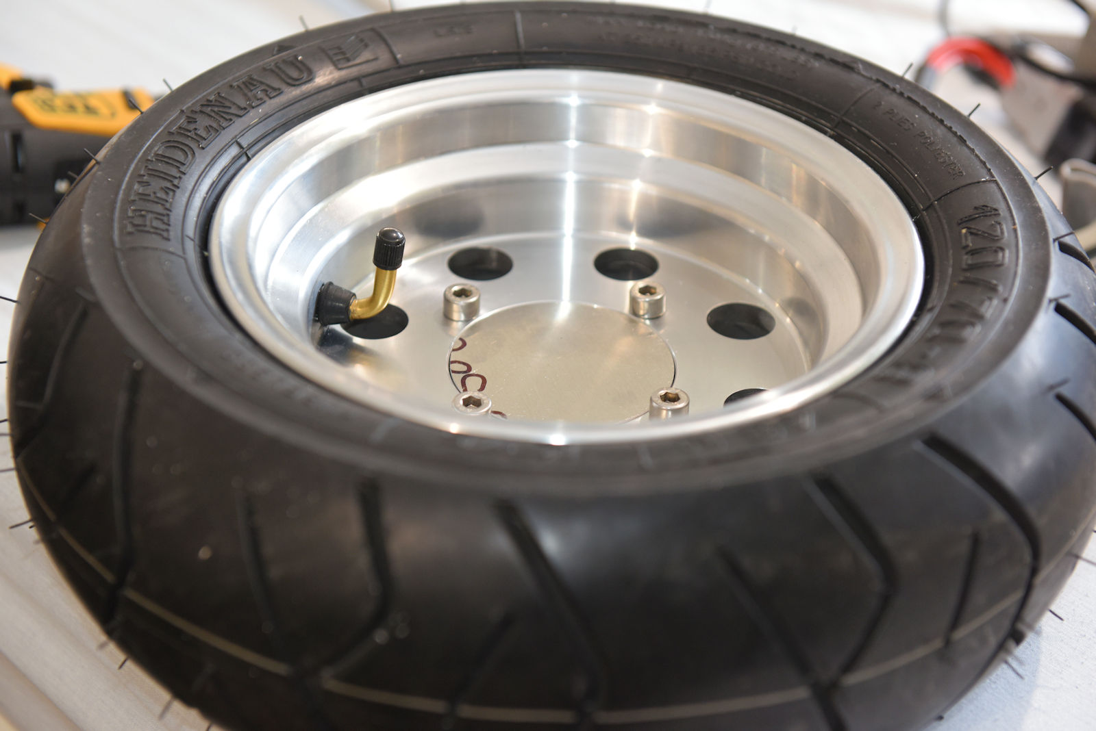 Yep. Same crappy 3.00 x 8 tyre in grey as most chairs use. But not for long!