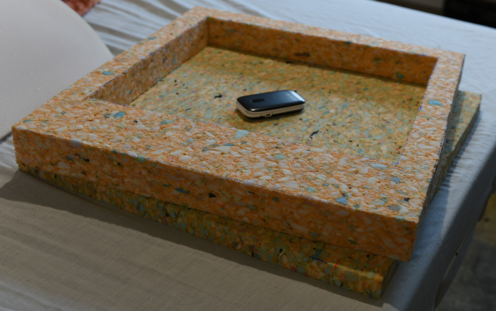 The orange foam is hard. The yellow bottom layer is very hard as foam goes.
