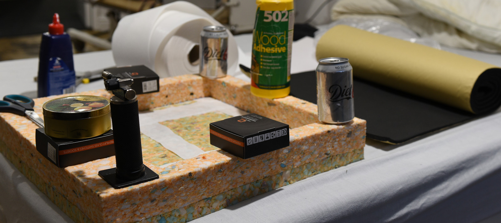 Assembled here with PVA and I am using a professional jig/rig to hold it together firmly while glue dries. The white bits are white scrim, as it does not stretch. So the cusion cant spread with a lot of use. Keeps it 19 wide, 20 deep.
