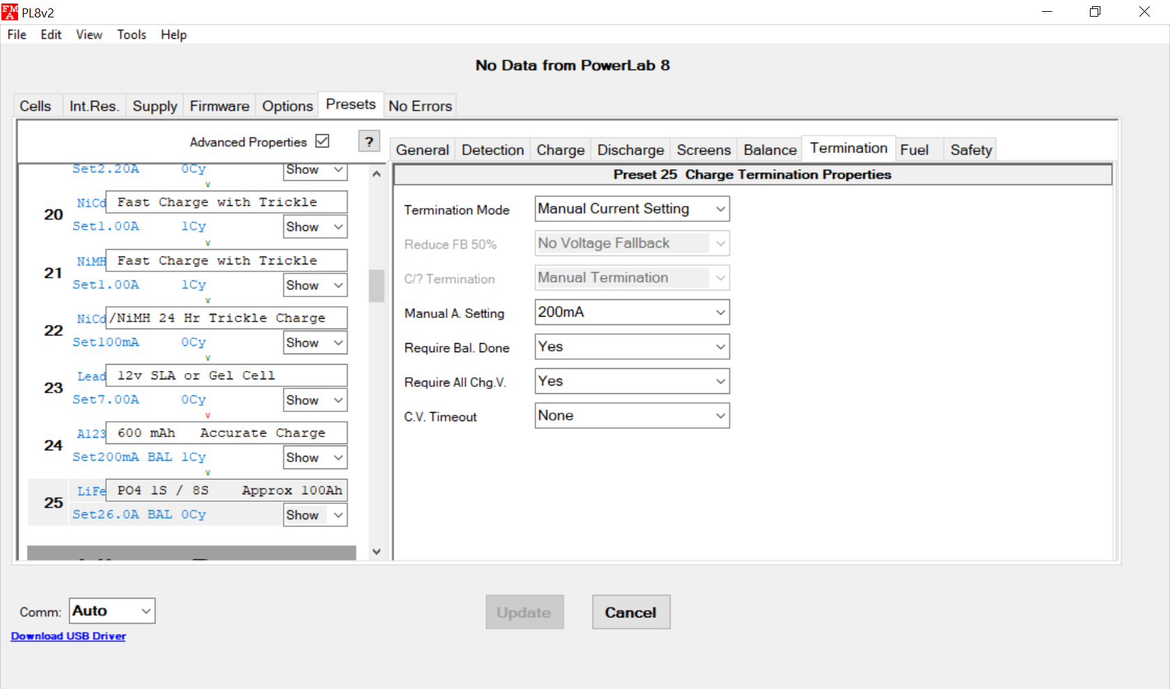 Termination current. If the pack is high C rate, and well balanced, then a 300th or 330th termination poing works well. So that would be say 300mA on a 100Ah pack. If the thing takes a long time to balance, and to hold voltage evenly after charge, then reduce that to 500th or 750th of capacity. So it stays at CV longer. A 4 hour CV timer is OK on a pack that balances easily. An 8 hour limit is too long, but may be needed to balance an out of balance pack, or much longer. So initially this should be set to off or never ending on a new built pack.