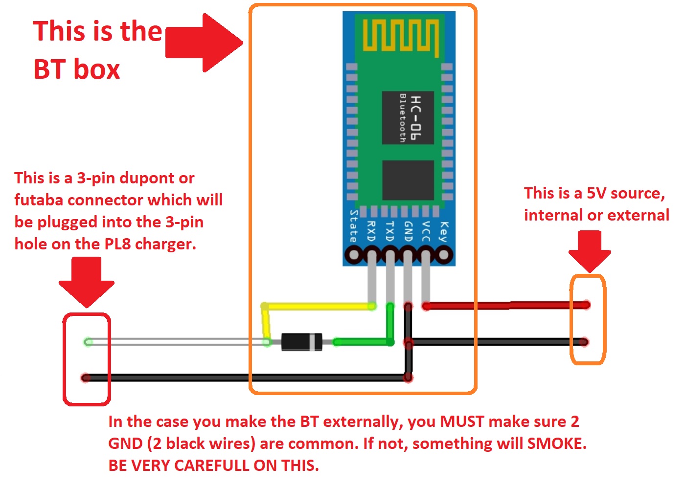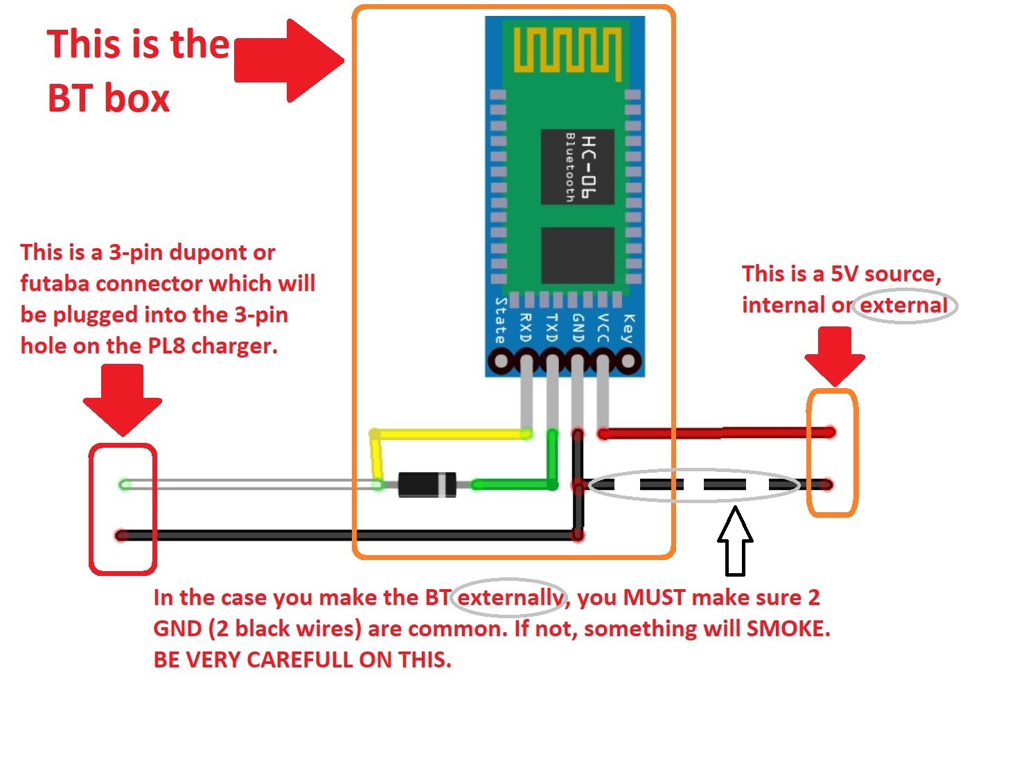 Then you need one small low drop diode. To connect the SEND and RECEIVE down 1 wire. And also the plus and minus 5V down a normal servo wire to outside the case. With a small wire loop. The BT and regulator stay inside the PL8. The wire is a loop that plugs into where the PL8 has its 3 pin ouput.