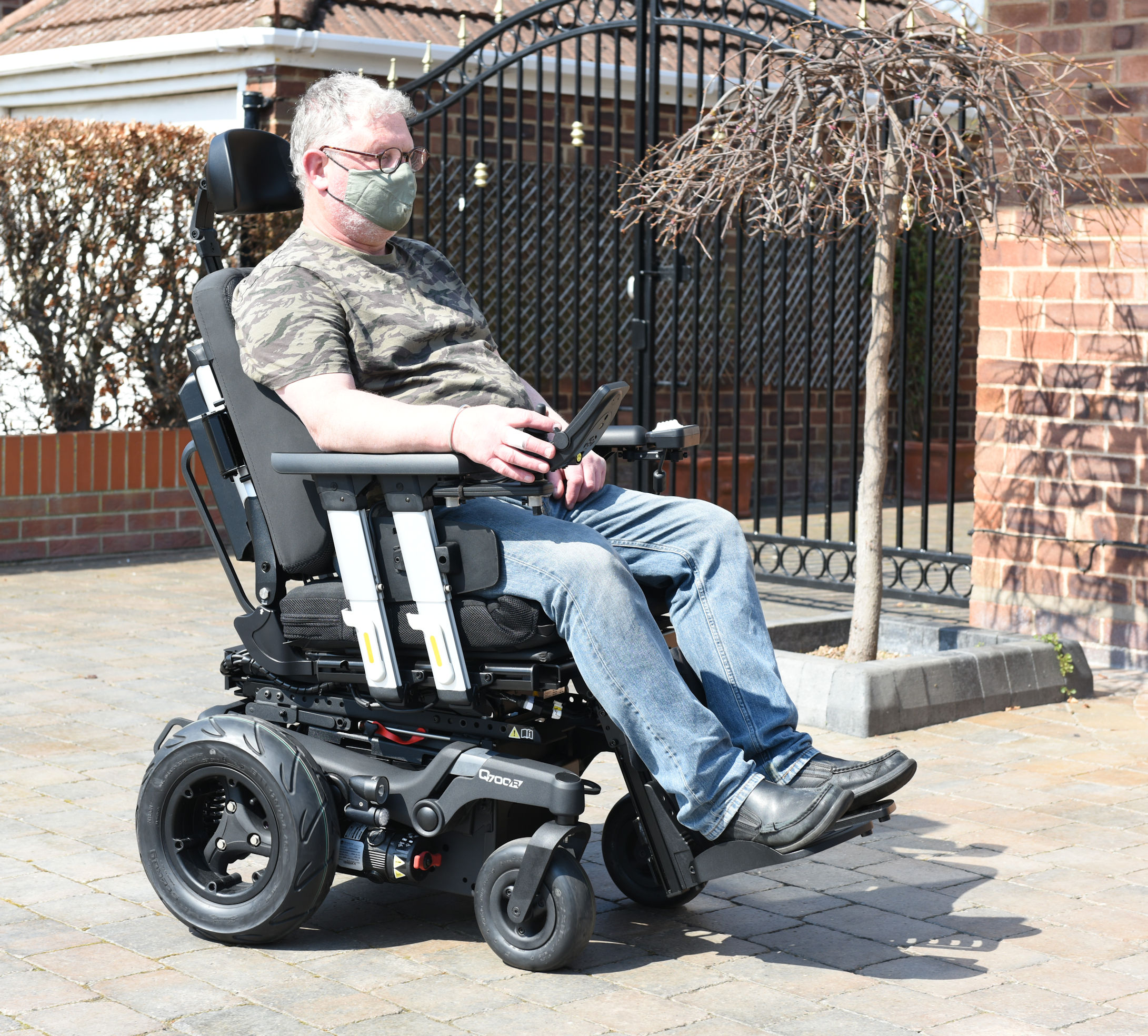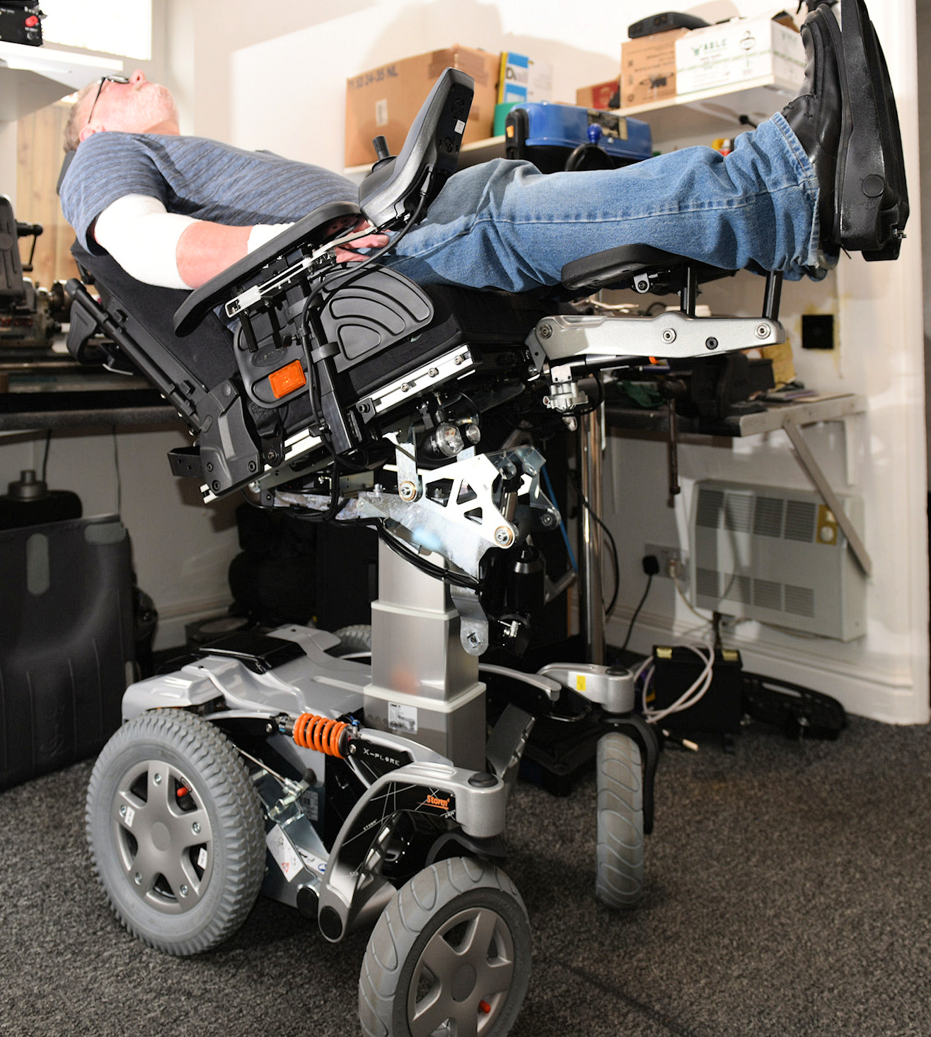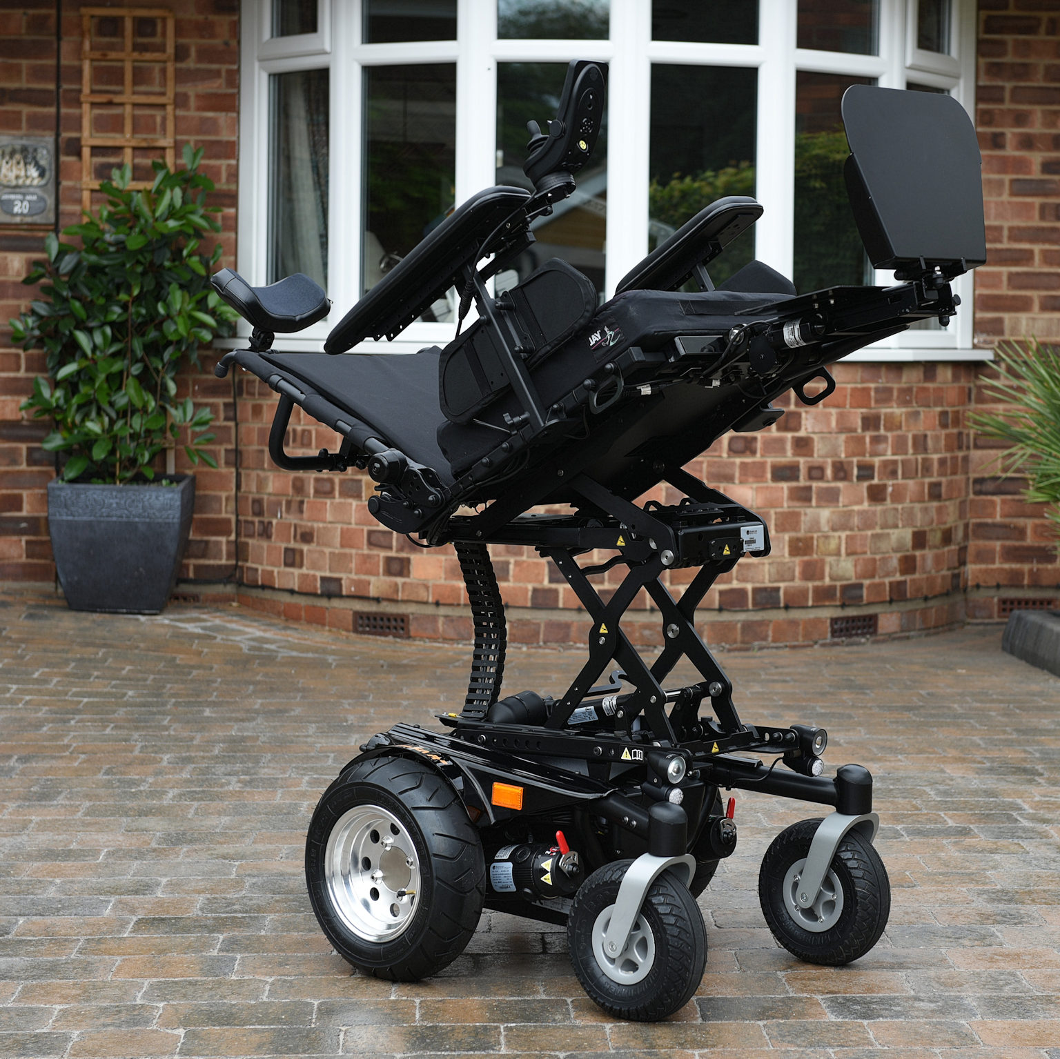 Also has user options: Seat lift, tilt, recline, and importantly power centre mount footplate in place of seperate swing away ones. As it allows the seat to move back a couple of extra inches for good CG position and shorter chair with better steering control. And narrower front end for easy access to doorways etc.