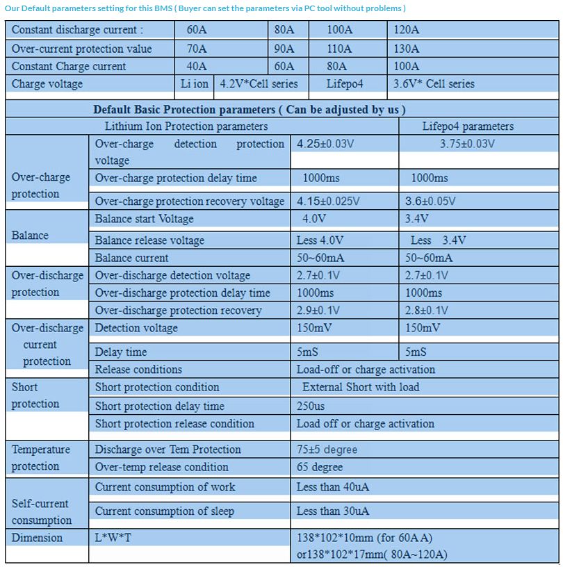 I read through that entire manual and did a search for balance current. Much of the manual is pretty sensible, but I found no mention whatsoever of balance current. If I recall correctly I had long ago looked at a pic of the board and saw that the resistors used for balance were very small SMD (at most 1/4 Watt, more likely 1/8 or 1/10) so the balance current is necessarily tiny. Hence their insistence that you manually top balance the cells (a good idea in any case). This may work out OK in a solar panel backup installation where continuous discharge rates are fairly low and fairly constant. It will not work well in a char with very high and variable discharge currents - with the high current, cell differences, e.g. internal resistance differences, will cause larger imbalances during discharge and this BMS will have an impossible time re-balancing them during charge.