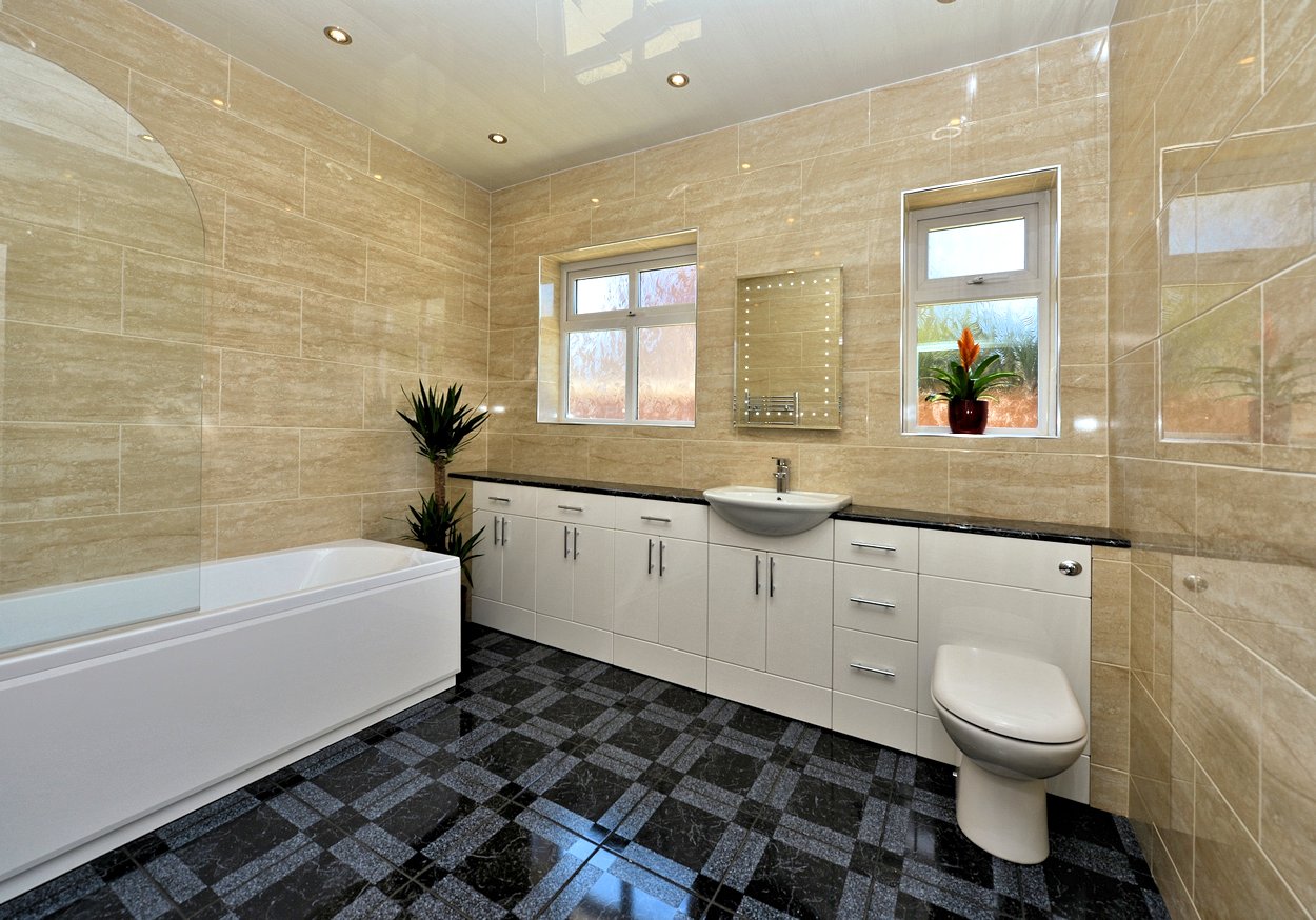 Ceramic tiles on concrete floor. bathroom. Also a decade old.