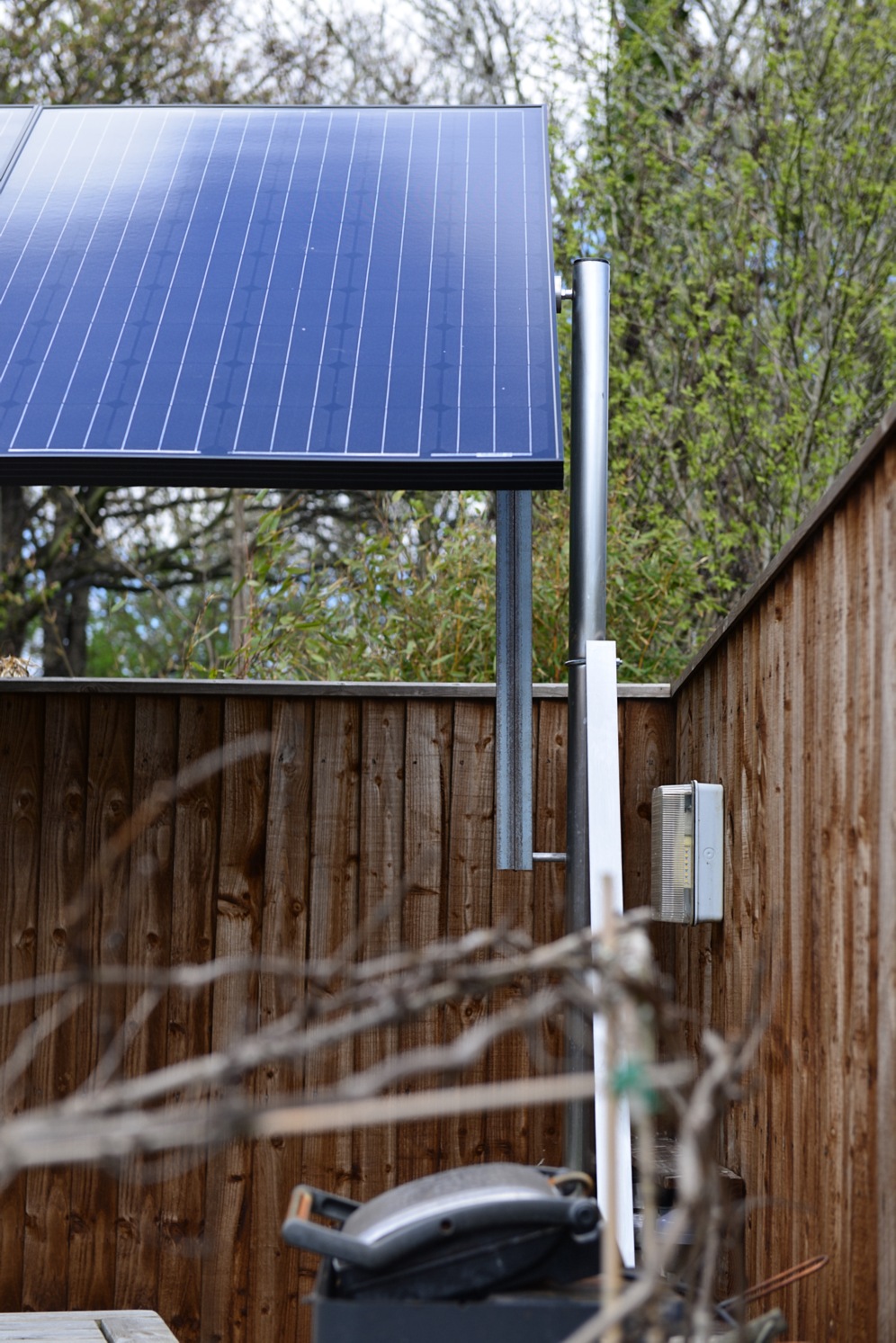 Bar fitted. Post concreted, grass replaced. Cables (2x cheap 6mm sq Grey twin and earth cable as used when fitting an electric shower), runs INSIDE this post, and under the grass to my bedroom... At the top of the pole there are 2 Anderson connectors.