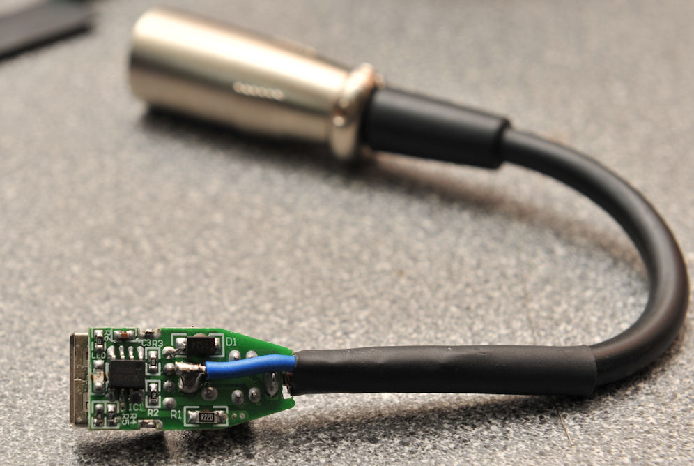 Here I have already added a 2 core cable to the Neutrik "charger" socket. These are £3 on eBay too. The cable needs soldering, and any old bit of cable will likely do here. This is a bit that came from an old hair dryer. My hair is long gone! The bit on the right is the tiny inverter taken from its case, and changes the 24v to 5v for the USB.